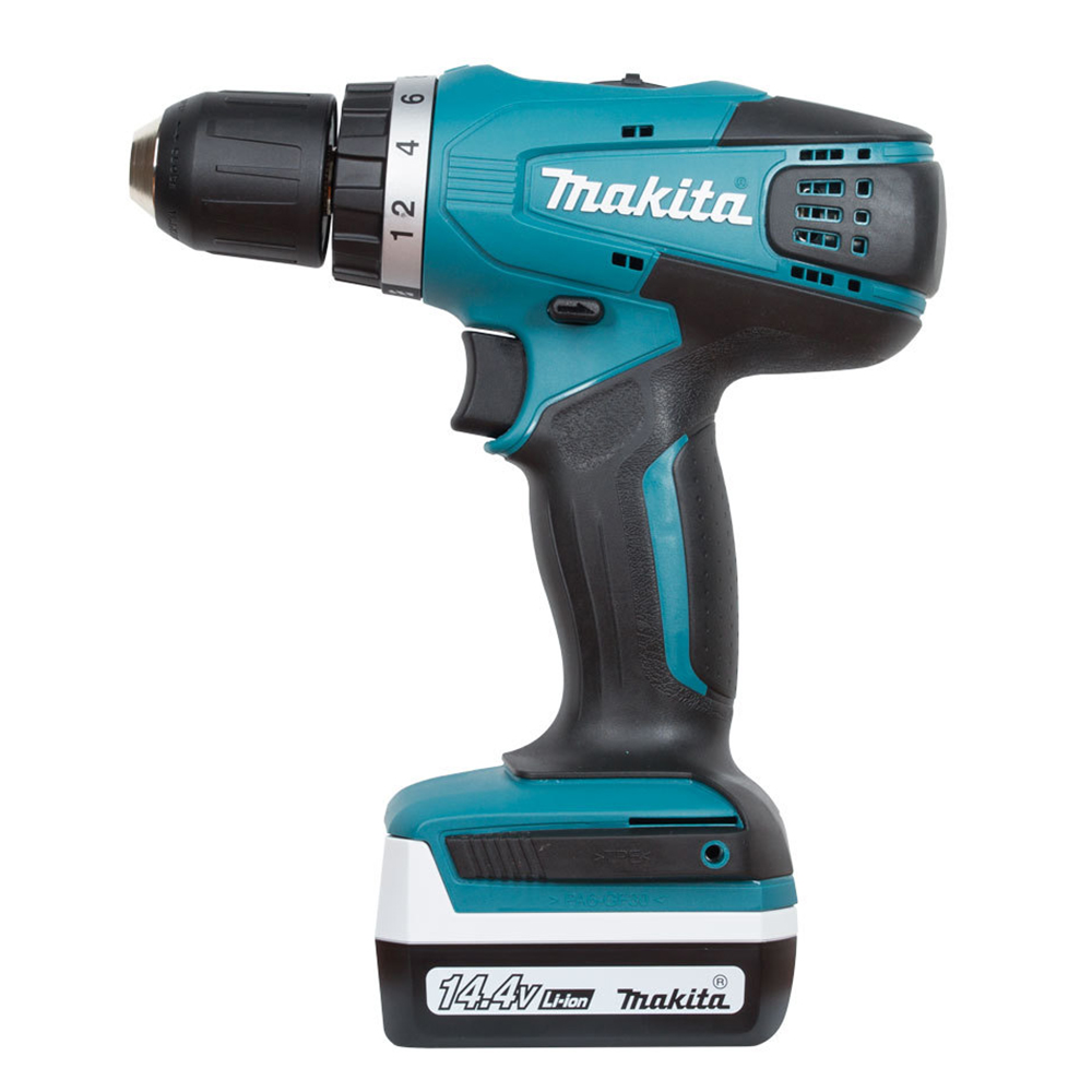 Высококачественный аккумуляторный шуруповерт с функцией дрели и двумя скоростями от одно из ведущих мировых производителей профессионального ручного электрического инструмента, японской компании Makita. Предназначен для заворачивания/отворачивания шурупов, винтов и саморезов в монтажно-сборочных, строительных и отделочных работах. Уверенно справляется со сверлением цветных и черных металлов, стали (отверстия до 10 мм), древесины (до 25 мм), керамики, композитных и полимерных материалов. Выключатель оборудован электронной регулировкой скорости вращения, что дает возможность легко подобрать оптимальный режим для каждого конкретного вида работ. Благодаря двухскоростном стальному редуктору и мощному электродвигателю шуруповерт Makita DF347DWE может развивать впечатляющий крутящий момент до 30 Нм. При работе с мягкими материалами усилие затяжки можно легко регулировать с помощью 16-и скоростной муфты-трещотки, а быстрозажимной патрон с рабочим диаметром 10 мм упрощает и значительно ускоряет смену инструмента. Двигатель оснащен эффективным тормозом, переключение реверса выполняется одним нажатием не соответствующую кнопку. Питание устройства осуществляется литий-ионной батареей с емкостью 1,3 Ач, напряжением 14,4В и поддержкой технологии LXT. Кроме двух таких батарей в комплект поставки включено фирменное зарядное устройство, обеспечивающее полное восстановление емкости всего за 30 мин.