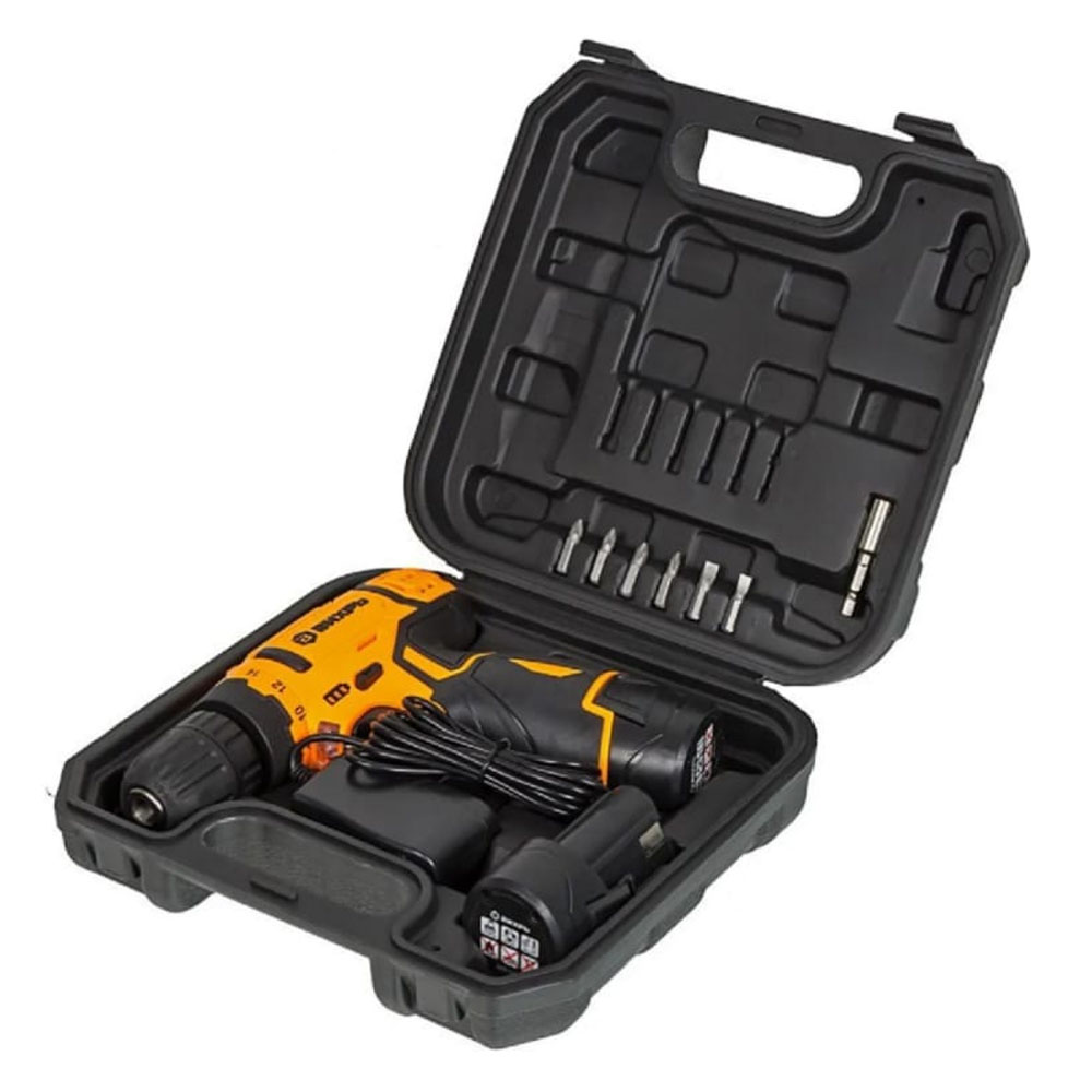 Дрель-шуруповерт аккумуляторная ВИХРЬ ДА-12Л-2КА – незаменимый помощник мастера в ремонте или строительстве. Прибор аккуратно сверлит отверстия на поверхностях из дерева и металла, а также накрепко закручивает шурупы. В комплект к дрели-шуруповерту поставляется удобный кейс, в котором можно хранить инструмент, зарядку к нему и другие рабочие детали. Не требует подключения к сети, что позволяет использовать ее в помещениях, где нет доступа к системе электропитания. Рабочие элементы легко заменить благодаря быстрозажимному патрону. Для ослабления креплений и выкручивания шурупов есть обратный ход. Форма рукоятки удобная, с резиновыми вставками, не скользит в руке. Система охлаждения мотора за счет вентиляционных отверстий на корпусе. Модель работает от надёжного литий-ионного аккумулятора (Li-Ion).