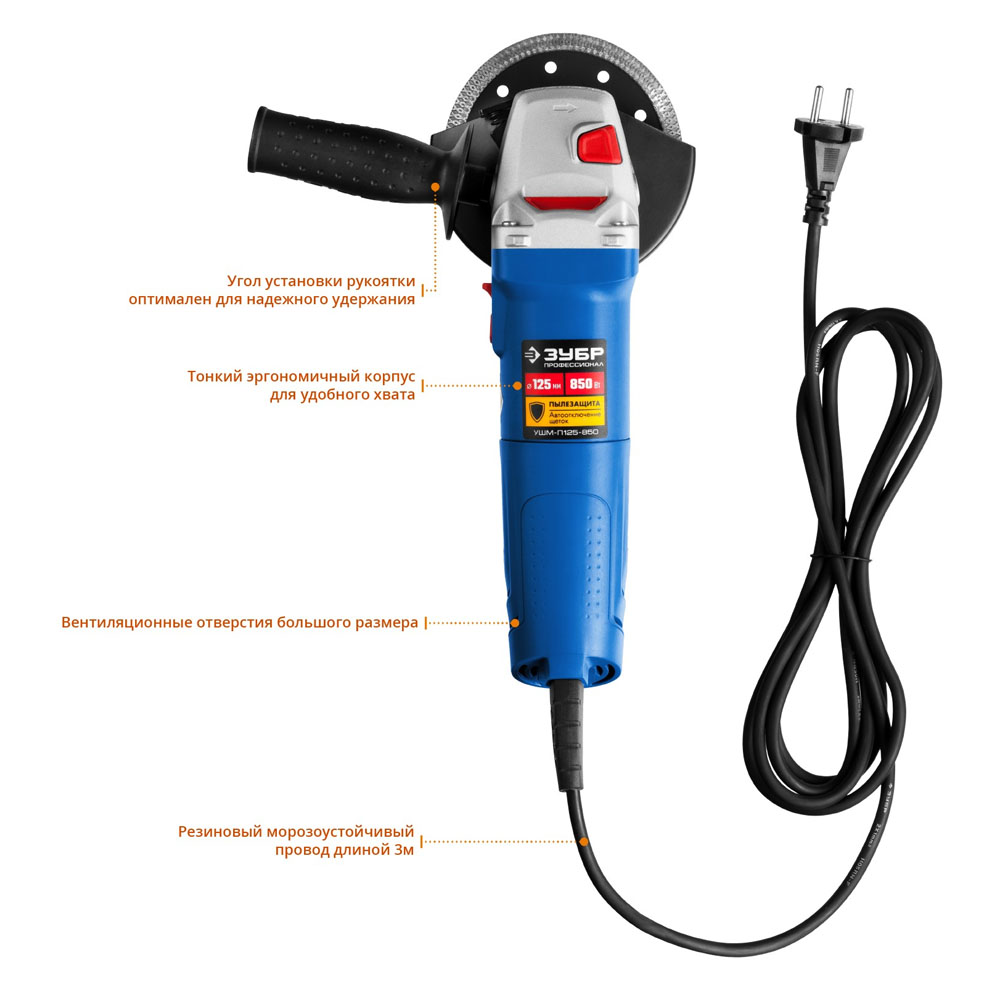 Для зачистки, шлифовки и резки металлов, обработки бетона и камня при установке соответствующих шлифовальных, отрезных, алмазных кругов