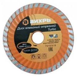 Диск алмазный отрезной Турбо сухая резка Вихрь - это алмазный отрезной диск, который используется совместно с угловыми шлифмашинами (болгарками) для сухой резки гранитных, бетонных, кирпичных и каменных изделий.