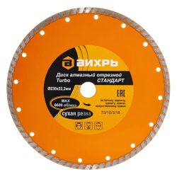 Диск алмазный отрезной Турбо СТАНДАРТ, 230 х 22,2 мм, сухая резка Вихрь - используется совместно с угловыми шлифмашинами для сухой резки гранитных, бетонных, кирпичных и каменных изделий.