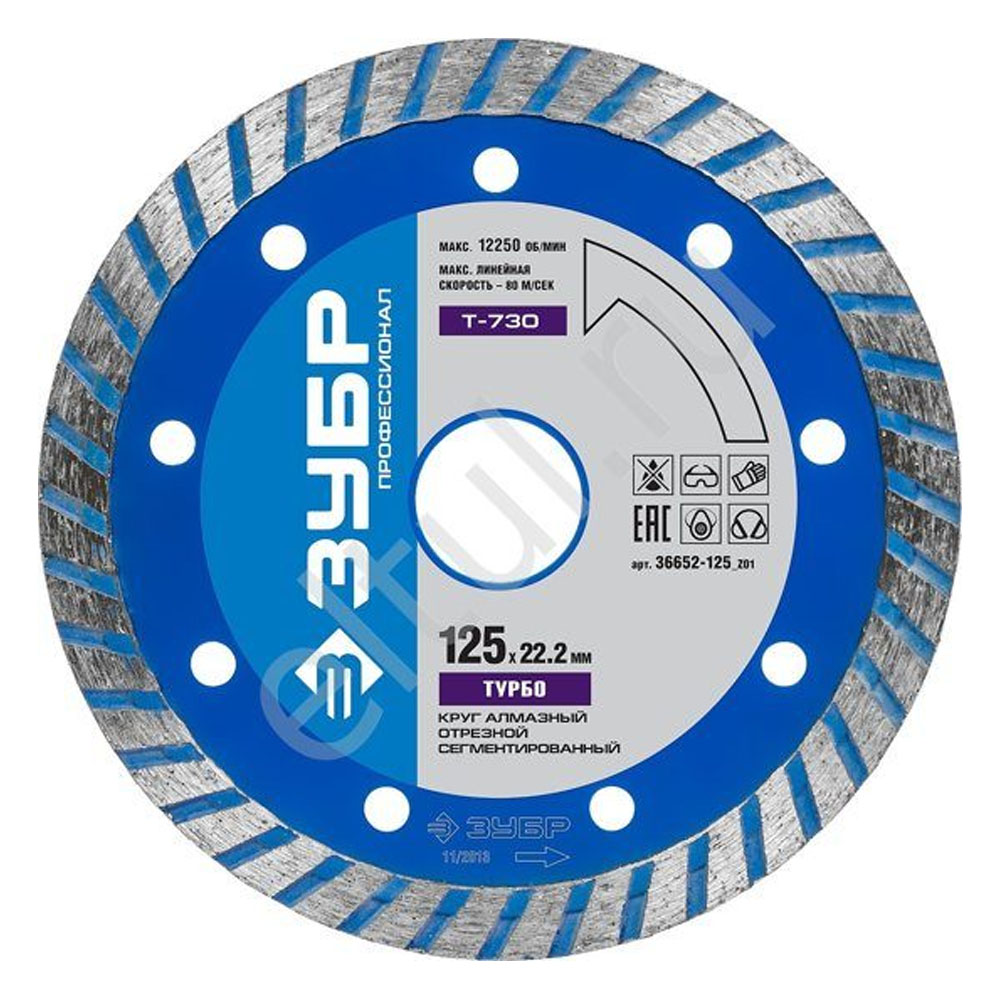Круг отрезной алмазный (сухая и влажная резка, 22,2x125 мм) Зубр ПРОФИ используется для обработки бетона, бордюрного камня, облицовочного кирпича, тротуарной плитки.