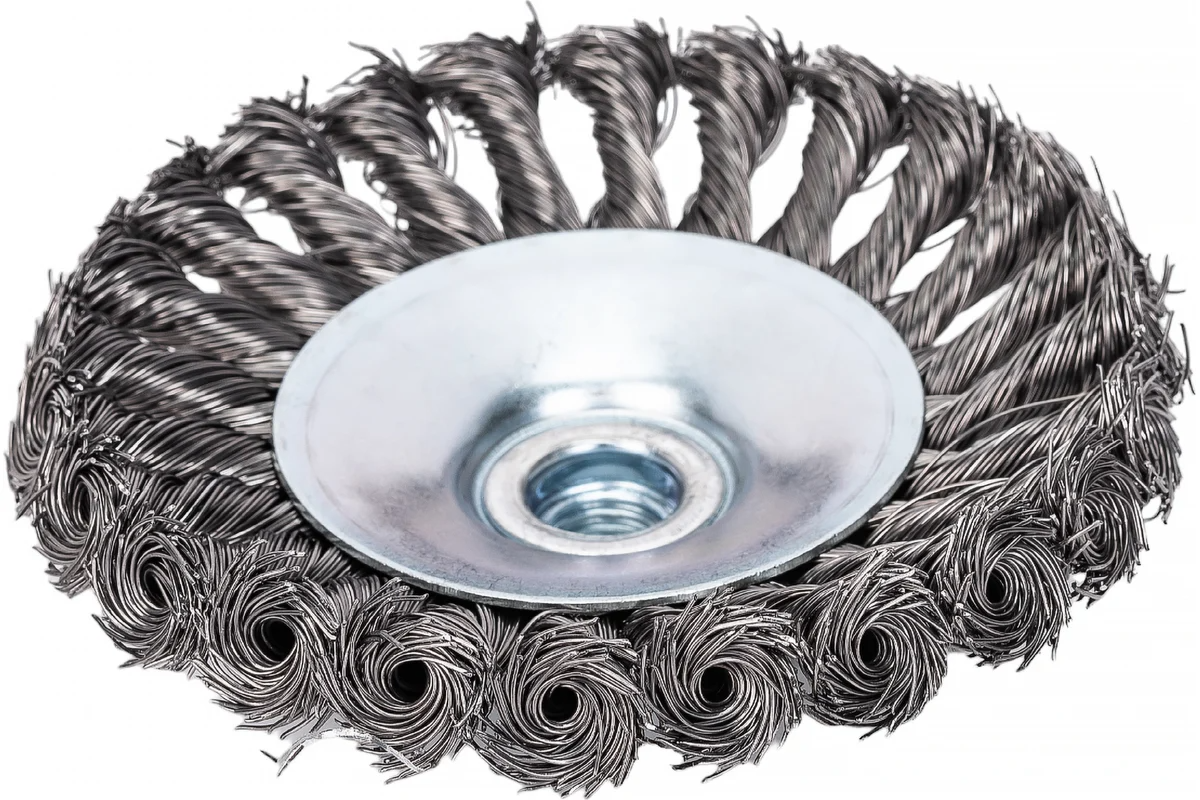 Щетка для УШМ 125 мм M14 волат диск на болгарку косичка (81060-125) - это надежный инструмент для грубой очистки металлических поверхностей от ржавчины, грязи, удаления лакокрасочных покрытий и зачистки сварных швов.