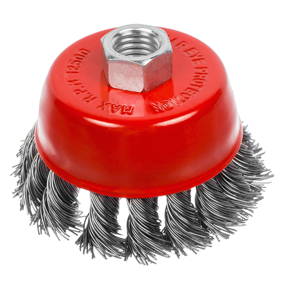 Кордщетка чашечная РемоКолор ⌀ 75 мм 45-1-203 используется для УШМ с посадочной гайкой М14. Витая стальная проволока, толщиной 0,5 мм.