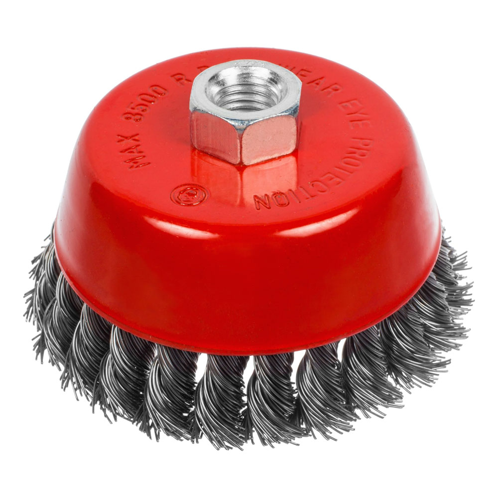 Кордщетка чашечная РемоКолор ⌀ 100 мм 45-1-205 используется для УШМ с посадочной гайкой М14. Витая стальная проволока, толщиной 0,5 мм.