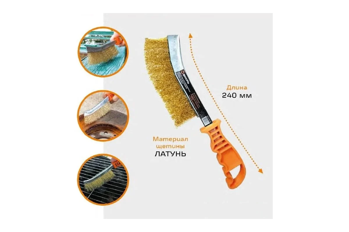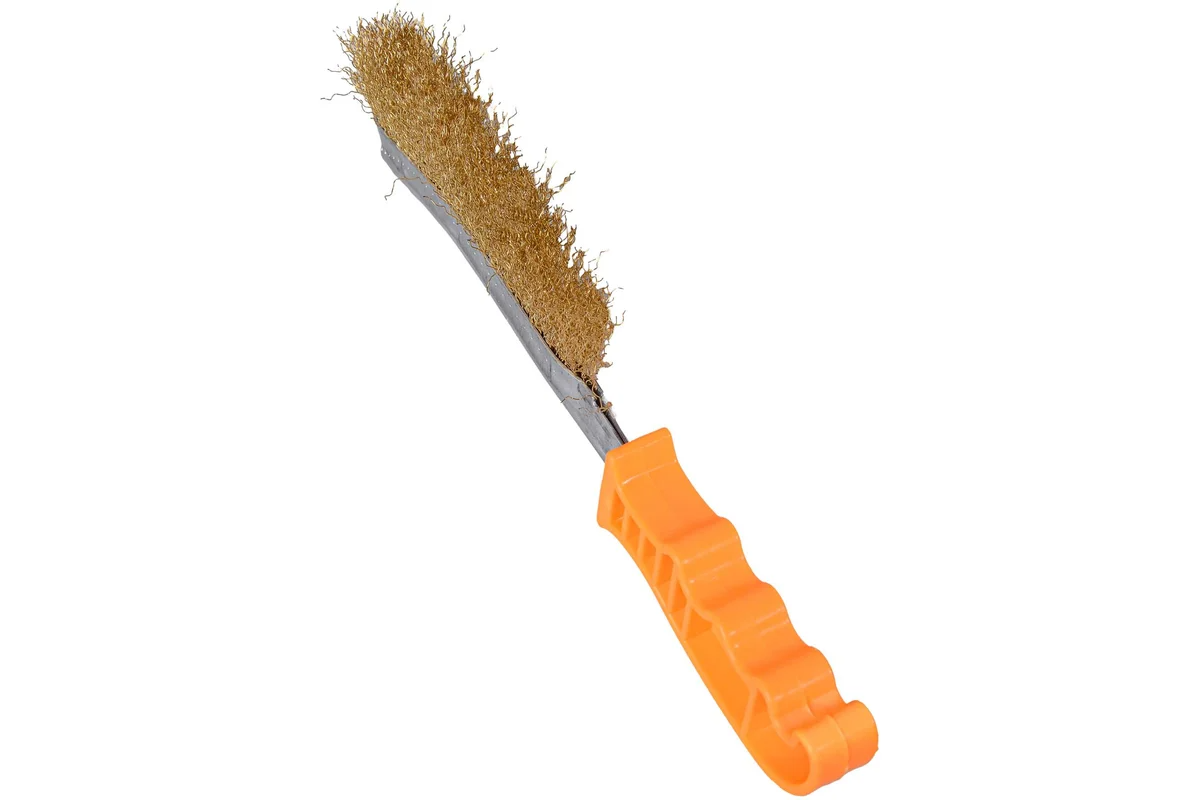 Она состоит из металлического корпуса и стальной латунированной рифленой проволоки. Пластмассовая рукоятка щетки имеет рифленую поверхность, что облегчает ее захват. Общая длина - 240 мм.