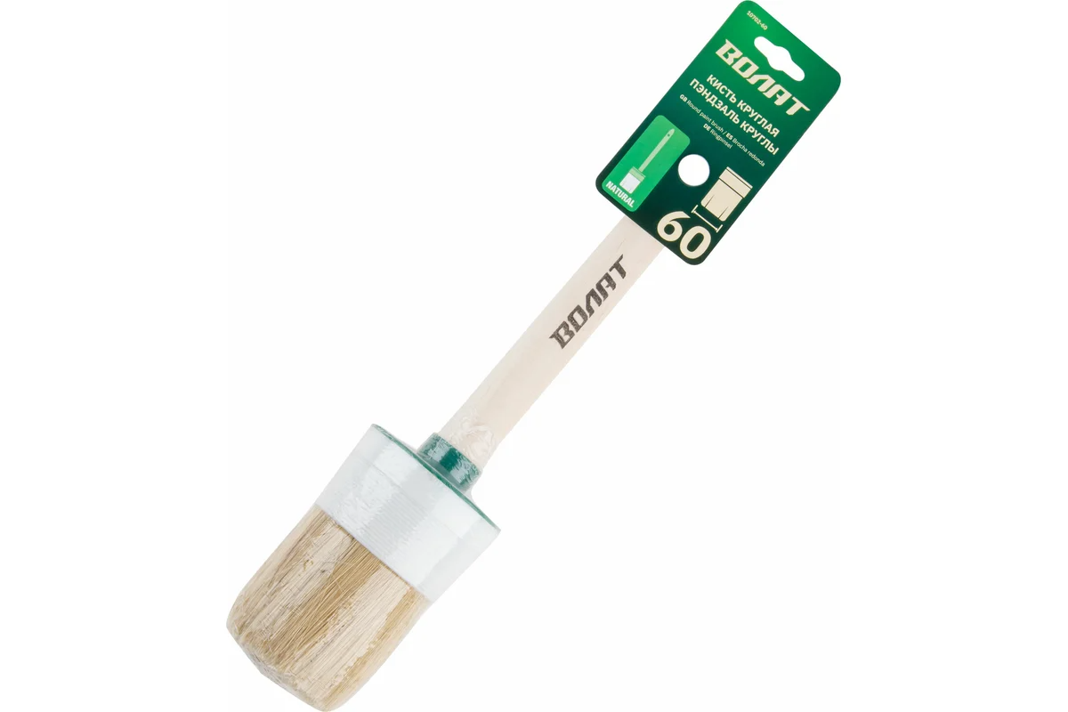 Круглая кисть ВОЛАТ №18 60 мм 10702-60 упрощает окрашивание и пропитку древесины. Густая щетина имеет хорошую впитываемость, что позволяет наносить материал толстым слоем без пробелов.