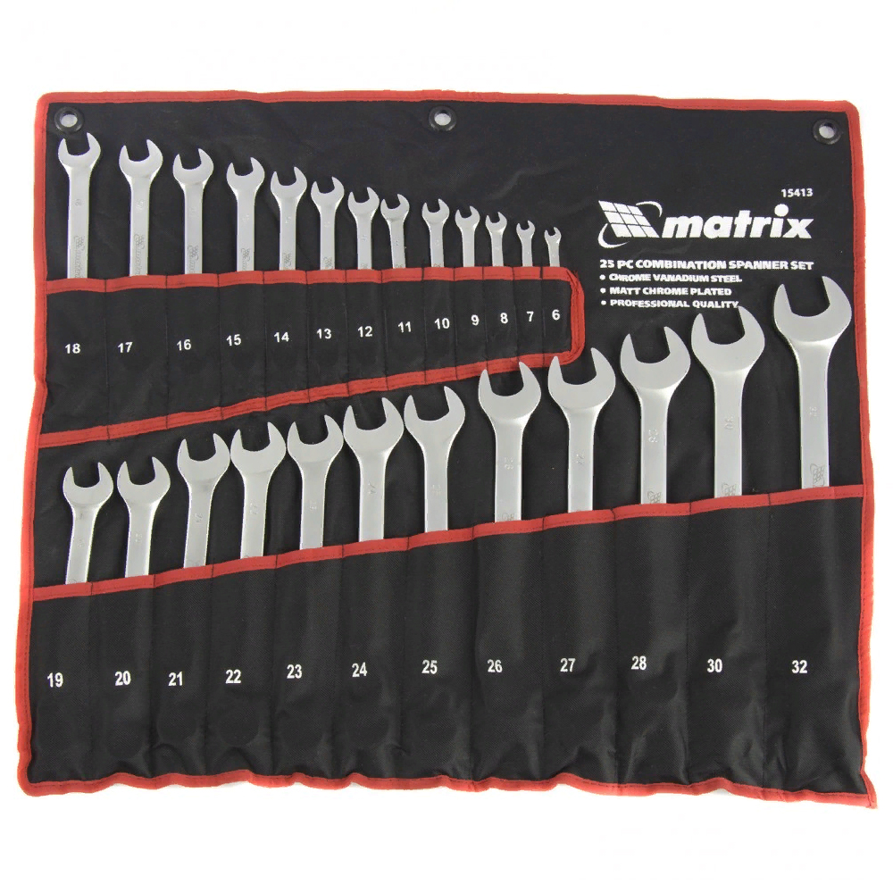 Набор ключей комбинированных Matrix 15413 с покрытием «матовый хром» включает 25 шт. из стали CrV размером 6-32 мм, которые пригодятся при проведении ремонтных работ дома или в гараже.
