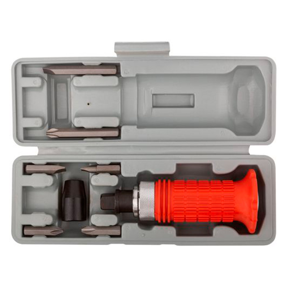 Ударно-поворотная отвертка с присоединительным размером 1/2 дюйма, с набором бит из 6 шт., с обрезиненной ручкой, в пластиковом боксе, используется для работ с резьбовыми соединениями.