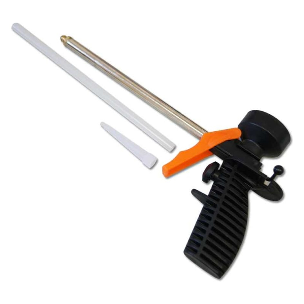 Пистолет для монтажной пены изготовлен из металла, оснащен эргономичной пластмассовой ручкой. Подача пены регулируется винтом.