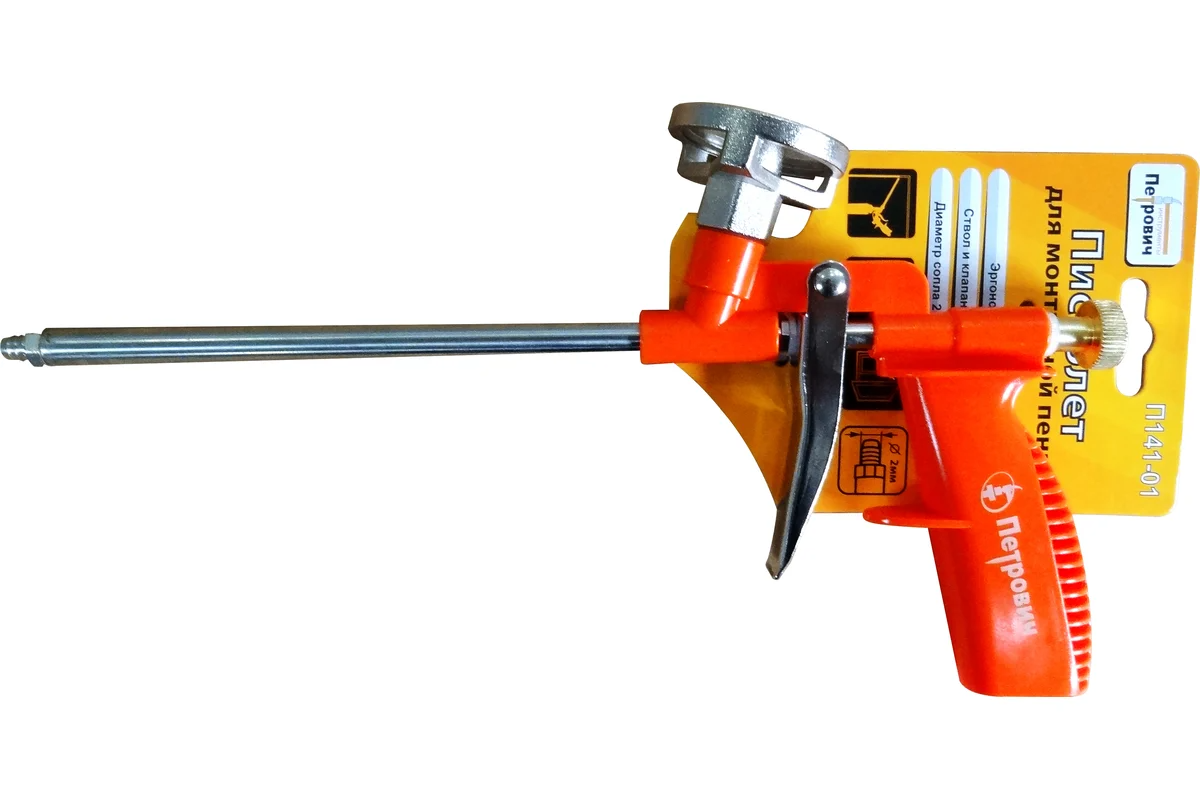 Пистолет для монтажной пены с пластмассовым корпусом Петрович П141-01 4100014458 применяется для нанесения монтажной пены при установке окон, дверей, различных элементов строительных конструкций. Длинный носик легко проникает в труднодоступные места.