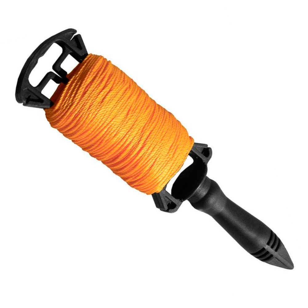 Нейлоновый шнур на катушке используется при проведении строительных работ для контроля отклонений от прямолинейности, например, при кладке стен из кирпича и пр.