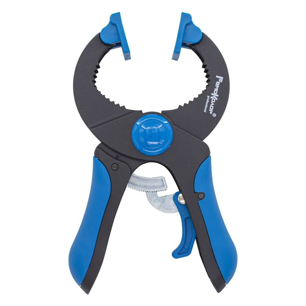 Пластиковый корпус, рычажный храповой механизм, используется для надежной фиксации заготовок в процессе их обработки. Корпус струбцины выполнен из пластика с резиновыми накладками.