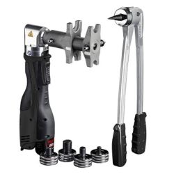 (48348-51) Набор инструмента для монтажа аксиальных фитингов включает в себя аккумуляторный запрессовщик, ручной расширитель, насадки на диаметры 16–32 мм, зарядное устройство 220 В и пластиковый кейс.