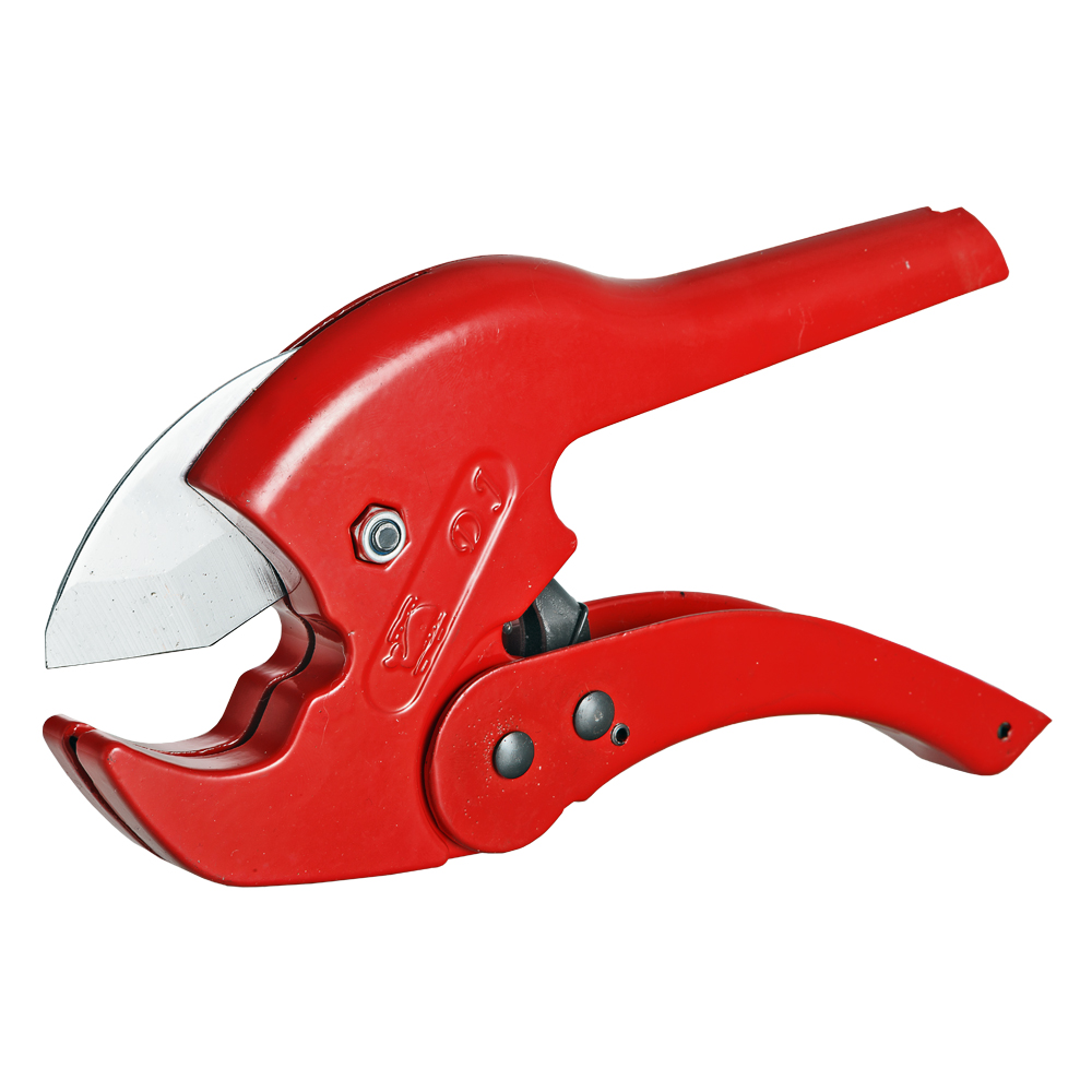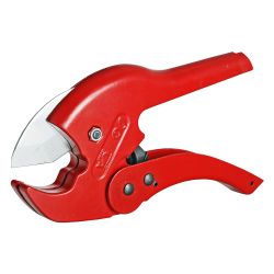 (VTm.395.0) Ножницы с пружинным механизмом открывания. Обеспечивают разрезание под прямым углом пластиковых и металлопластиковых (металлополимерных) труб диаметром до 40 мм. Конструкция инструмента включает нож из нержавеющей стали, храповой механизм, подпружиненную защелку, фиксирующую ножницы в закрытом положении. Внутри рукоятки расположена пружина, поднимающая нож.