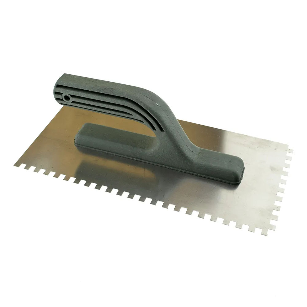 Гладилка зубчатая нержавеющая 130 х 280 мм, зуб 6 х 6 мм, пластиковая ручка Чеглок представляет собой плоское прямоугольное полотно из нержавеющей стали (с двух сторон зубчатое зуб 6 х 6 мм), с прикрепленной к нему пластиковой рукояткой. Гладилка зубчатая 130 х 280 мм используется при нанесении и выравнивания на керамическую плитку плиточного клея, при штукатурке и шпаклевке стен, при выведении гладких поверхностей потолка и пола строительными растворами. Удобная пластмассовая ручка хорошо ложится в ладонь, что повышает комфорт работы.