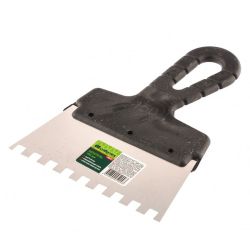 Шпатель из нержавеющей стали, с пластмассовой ручкой и зубьями 8 х 8 мм, применяется для равномерного нанесения клея при укладке мелкоформатной плитки, мозаики и т.д.