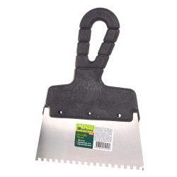 Шпатель из нержавеющей стали, с пластмассовой ручкой и зубьями 4 х 4 мм, применяется для равномерного нанесения клея при укладке мелкоформатной плитки, мозаики и т.д.