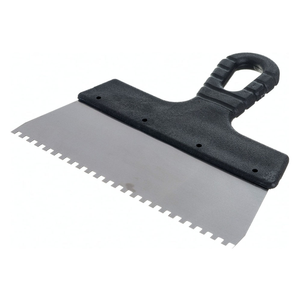 Шпатель из нержавеющей стали, с пластмассовой ручкой и зубьями 4 х 4 мм, применяется для равномерного нанесения клея при укладке мелкоформатной плитки, мозаики и т.д.