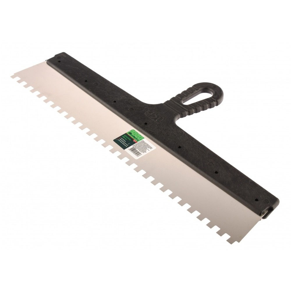 Шпатель шириной 450 мм из нержавеющей стали, с пластмассовой ручкой и зубьями 8 х 8 мм, применяется для равномерного нанесения клея при укладке мелкоформатной плитки, мозаики и т.д.