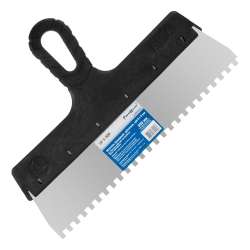 Фасадный шпатель РемоКолор 12-1-300 предназначен для нанесения клеевых составов, цементных монтажных смесей при укладывании кафельной плитки, приклеивании стеновых панелей. Полотно с зубьями 6х6 мм подойдет для укладки маленькой и средней по размерам плитки. Прочное полотно шириной 300 мм из нержавеющей стали, позволяет наносить раствор с большой вязкостью. Рукоятка выполнена из пластика и имеет эргономическую форму, что обеспечивает удобство при работе.