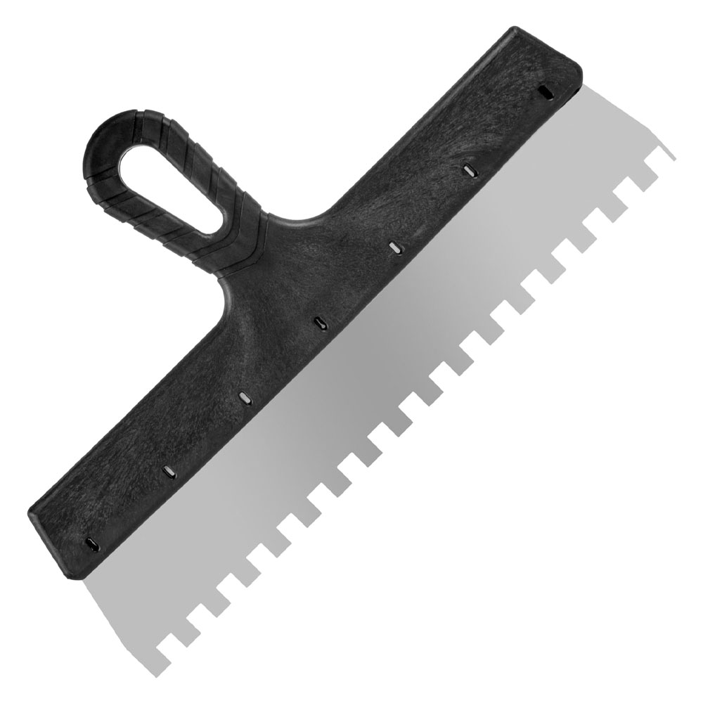 Зубчатый фасадный шпатель РемоКолор Мастер предназначен для нанесения клеевых составов, цементных монтажных смесей при укладывании кафельной плитки, приклеивании стеновых панелей. Полотно с зубьями 10х10 мм подойдет для облицовки стен крупными плитами. Прочное полотно шириной 350 мм из нержавеющей стали, позволяет наносить раствор с большой вязкостью. Рукоятка выполнена из пластика и имеет эргономическую форму, что обеспечивает удобство при работе.