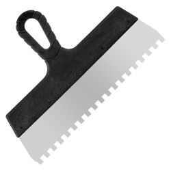 Фасадный шпатель РемоКолор 12-1-130 предназначен для нанесения клеевых составов, цементных монтажных смесей при укладывании кафельной плитки, приклеивании стеновых панелей. Полотно с зубьями 8х8 мм подойдет для облицовки стен крупными плитами. Прочное полотно шириной 300 мм из нержавеющей стали, позволяет наносить раствор с большой вязкостью. Рукоятка выполнена из пластика и имеет эргономическую форму, что обеспечивает удобство при работе.