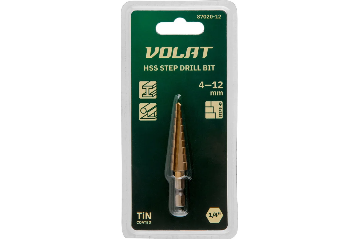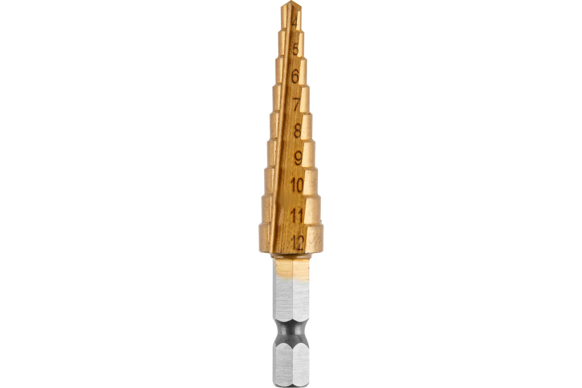 Сверло по металлу ступенчатое 4-12 мм ВОЛАТ HSS TiN (87020-12) позволяет получать отверстия различного диаметра и предназначено для работы с различными материалами. Выполнено из быстрорежущей стали с нитрид титановым покрытием.