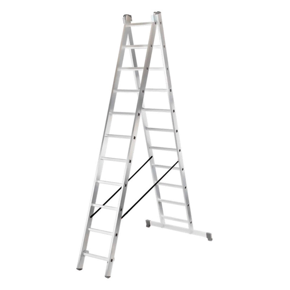 Складная алюминиевая двухсекционная лестница на 11 ступеней. Подходит для ремонтных и отделочных работ. Лестница должна быть установлена на ровной твердой горизонтальной поверхности.