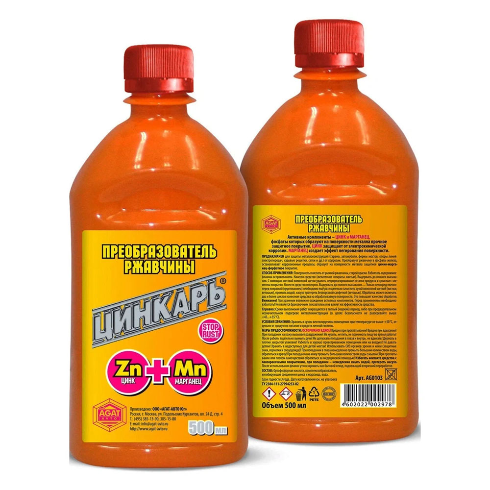 Преобразователь ржавчины «Цинкарь» - эффективное средство защиты металлических поверхностей от коррозии. Данное защитное средство было создано в 2002 г., и сочетает электрохимический и консервационный методы. Прежде всего, оно предназначается для обработки внешних частей автотранспортных средств, но может применяться и для защиты деталей иных механизмов и строительных конструкций.