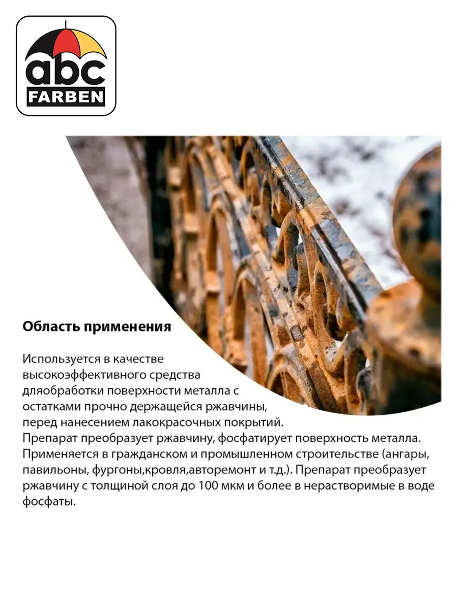 Используется в качестве эффективного средства для обработки поверхности металла с остатками прочно держащейся ржавчины перед нанесением лакокрасочных покрытий. Препарат нейтрализует ржавчину. Применяется в гражданском и промышленном строительстве (ангары, павильоны, фургоны, кровля, авторемонт и др.)120-140 г/м²межслойная сушка 2-3 часа. Через 10-12 часов после нанесения последнего слоя поверхность металла готова для нанесения грунта и защитного лакокрасочного материала.МеталлПоверхность металла очистить от грязи, отслоившегося покрытия, обезжирить. Препарат нанести с помощью кисти или тампона.