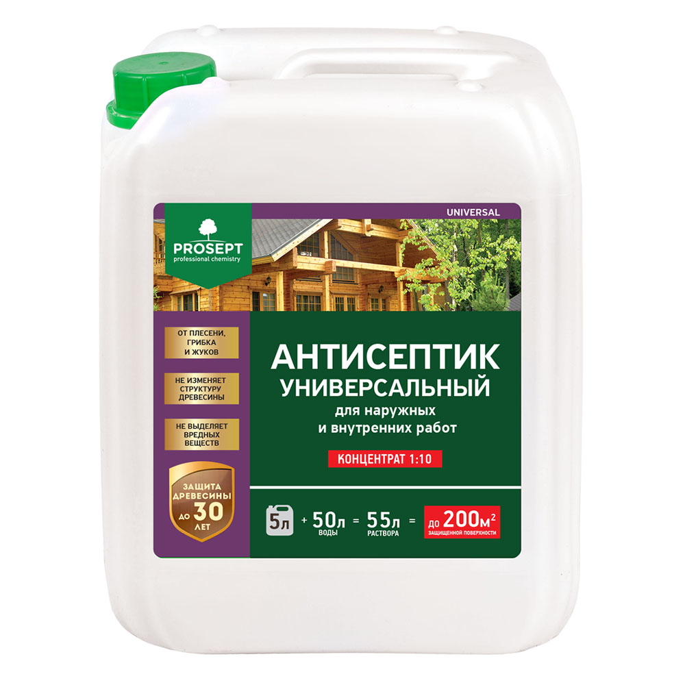 PROSEPT UNIVERSAL – антисептическая пропитка на водной основе глубокого проникновения. Предназначается для усиленной защиты древесины от гниения, плесени, синевы и насекомых-древоточцев. Для наружных работ используется в качестве грунтовочного слоя перед покрытием декоративно-защитными материалами, а для внутренних работ может применяться также или как самостоятельное покрытие. Обеспечивает хорошую адгезию и защиту от гниения даже в случае износа и разрушения лакокрасочного покрытия.