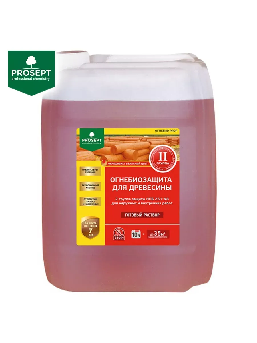 PROSEPT ОГНЕБИО PROF – комплексная огнебиозащитная пропитка для древесины, используемой внутри помещений и на открытом воздухе без прямого воздействия атмосферных осадков и контакта с грунтом. Пропитка защищает от возникновения и распространения огня, а также от воздействия насекомых и грибков.