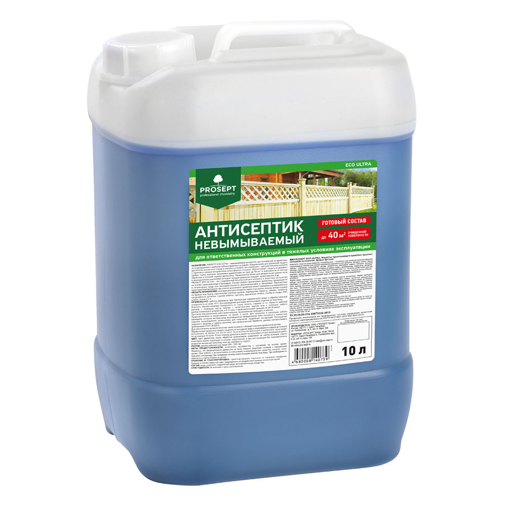 Невымываемый антисептик ECO ULTRA для ответственных конструкций (готовый состав) 10 л PROSEPT предназначается для усиленной защиты древесины различных пород в тяжелых условиях эксплуатации – при длительном контакте с грунтом и прямом воздействии атмосферных осадков.