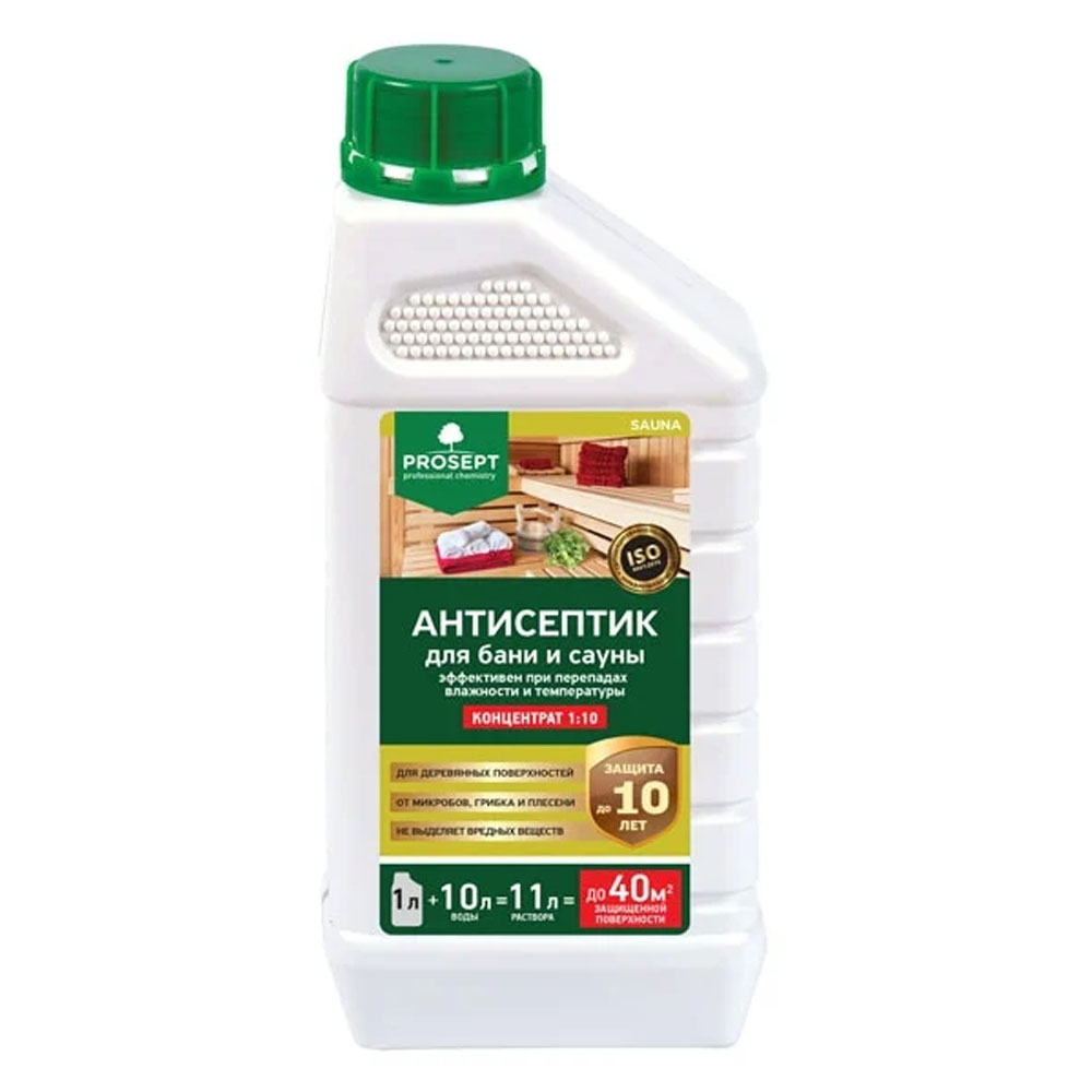 PROSEPT SAUNA – антисептик на водной основе для бань и саун. Предназначен для защиты древесины от действия дереворазрушающих и деревоокрашивающих плесневых грибов в саунах, парных, моечных и прилегающих к ним помещениях. Содержит компонент, предотвращающий развитие болезнетворных микробов, спор грибков. Обеспечивает надежную защиту при циклическом увлажнении и перепадах температур.