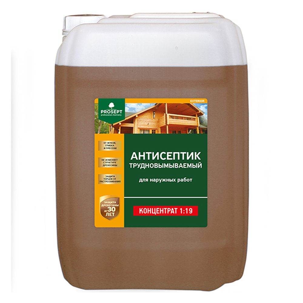 PROSEPT EXTERIOR предназначен для защиты и консервации древесины различных пород (от гниения, плесени, синевы и насекомых-древоточцев), эксплуатируемой на открытом воздухе при непосредственном воздействии атмосферных осадков, почвенной влаги, гигроскопическом и конденсационном увлажнении.