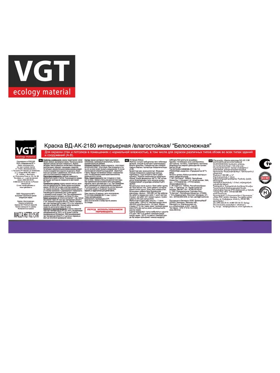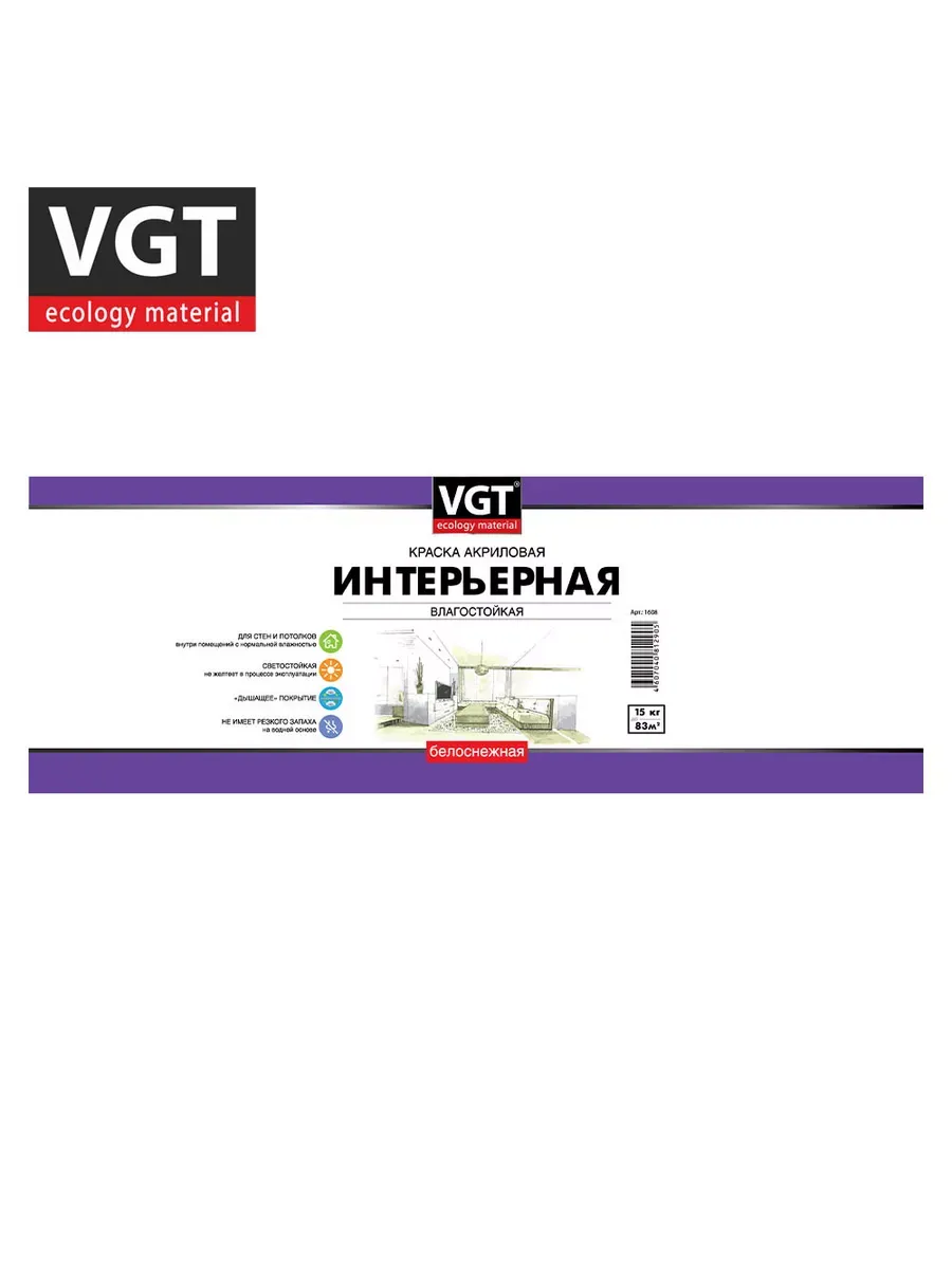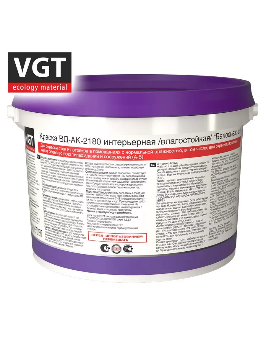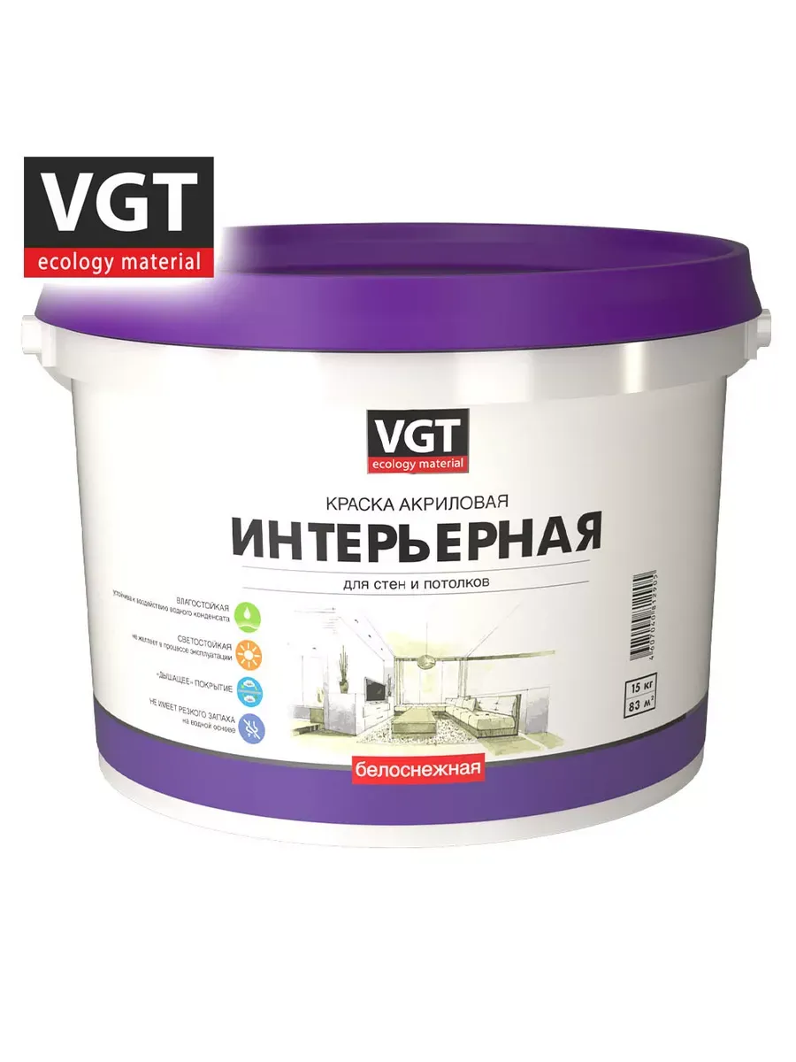 Краска ВД интерьерная влагостойкая 15,0кг ВГТ (ВД-АК-2180) белоснежная