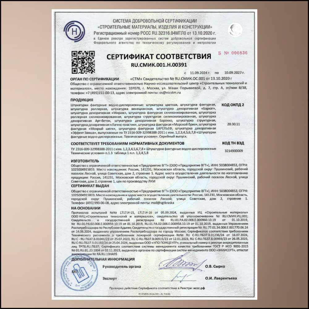 Штукатурка представляет собой пастообразную массу с перламутровыми частицами и добавлением специальных стеклянных микрошариков. Имеет высокую адгезию к бетонным, кирпичным, оштукатуренным, асбоцементным, гипсокартонным и т. п. поверхностям. Штукатурка обладает водостойкостью и стойкостью к мытью.