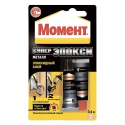 Эпоксидный клей Момент Супер Эпокси Металл не расширяется и не сжимается при отверждении, устойчив к воздействию воды, масел и растворителей.