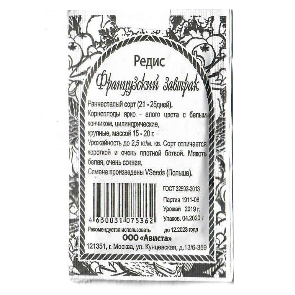 Раннеспелый (21-24 дня от всходов до технической спелости) сорт. Корнеплод удлиненный, с белым кончиком, массой до 20 г, диаметром 2-3 см. Мякоть белая, сочная, без горечи. Корнеплод полностью погружен в почву. Сорт устойчив к стеблеванию. Рекомендуется для выращивания в открытом грунте, весенних теплицах, пленочных укрытиях. Посев в грунт производится в конце апреля-начале мая на глубину 1 см по схеме 5-7х15 см. Урожайность 2,0-2,3 кг/м2. Для позднелетнего и осеннего употребления семена редиса высевают 15-20 июля.