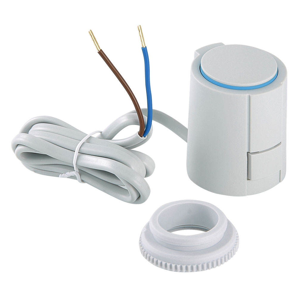 (VT.TE3040.A) Привод для автоматического управления радиаторным или коллекторным термостатическим клапаном систем водяного теплого пола и охлаждения зданий по сигналу от термостата, датчика или контроллера. Действие основано на расширении заполняющего сильфон армированного парафина при протекании электрического тока через встроенный нагревательный элемент. Нормально открытый. Присоединение сервопривода к клапану – через переходник (в комплекте). Технические характеристики: напряжение питания – 220 В (50 Гц); максимальный ток – 300 мА; мощность – 2,0 Вт; сечение проводников (2 шт.) – 0,75 мм2; длина провода – 1 м; присоединительный размер – М30 х 1,5.