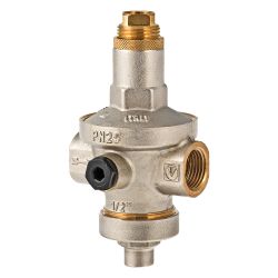 (VT.085.N) Назначение мембранного редуктора – поддержание заданного давления в установках отопления, водоснабжения, пневмопроводах, технологических системах, транспортирующих жидкости, газы, неагрессивные к примененным материалам. Диапазон настроек – 1–7, заводская уставка – 3 бара. Стабильность регулируемого параметра обеспечивается независимо от скачков сетевого давления. Наличие демпфирующей камеры позволило минимизировать допустимые колебания выходной величины: ±5 %. Редуктор с двух сторон имеет отверстия с резьбой ¼” для установки манометра. Благодаря отсутствию трущихся частей мембранные редукторы менее зависят от загрязненности воды, чем поршневые, более надежны. Мембрана выполнена из армированного EPDM. Максимальная рабочая температура – 80 °С, номинальное входное давление – 25 бар.