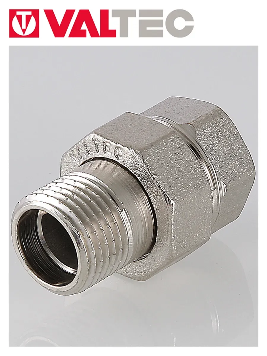 (VTr.341.N) Прямой разъемный сгон, смонтированный из двух частей с помощью накидной гайки (соединение типа «американка»). Резьба – внутренняя/наружная, цилиндрическая трубная по ГОСТу 6357 (ISO 228, EN 10226). Внутренняя резьба совместима также с наружной конической трубной резьбой по ГОСТу 6211 (ISO R7). Детали выполнены из латуни, никелированы. Уплотнительное кольцо – из синтетического каучука EPDM. Гайку следует накручивать с приложением момента не более 30 H•м.