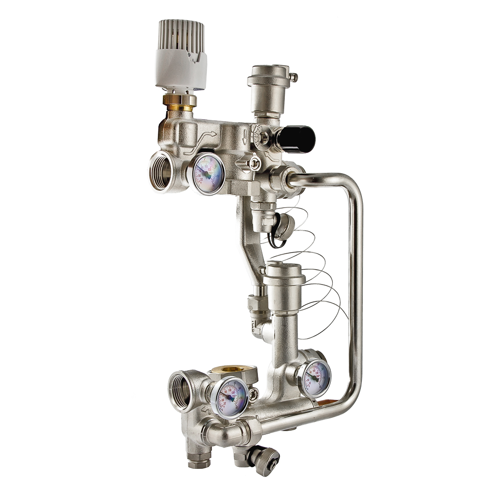 (VT.COMBI.0) В насосно-смесительном узле VALTEC COMBI для водяных теплых полов приготовление теплоносителя с температурой от 20 до 60 °С происходит за счет подмеса жидкости из обратной линии. Регулирование осуществляется двухходовым клапаном, установленным в подающем коллекторе и управляемым термостатической головкой с выносным погружным датчиком, который размещен на выходе смесительного узла.(При использовании контроллера отопления функция управления клапаном передается ему.) Балансировочный клапан в линии подмеса задает соотношение теплоносителя, поступающего из обратной линии вторичного контура и прямой линии первичного. Другие основные элементы узла: байпас с перепускным клапаном; встроенные шаровые краны для отключения циркуляционного насоса; автоматический воздухоотводчик; погружные термометры.