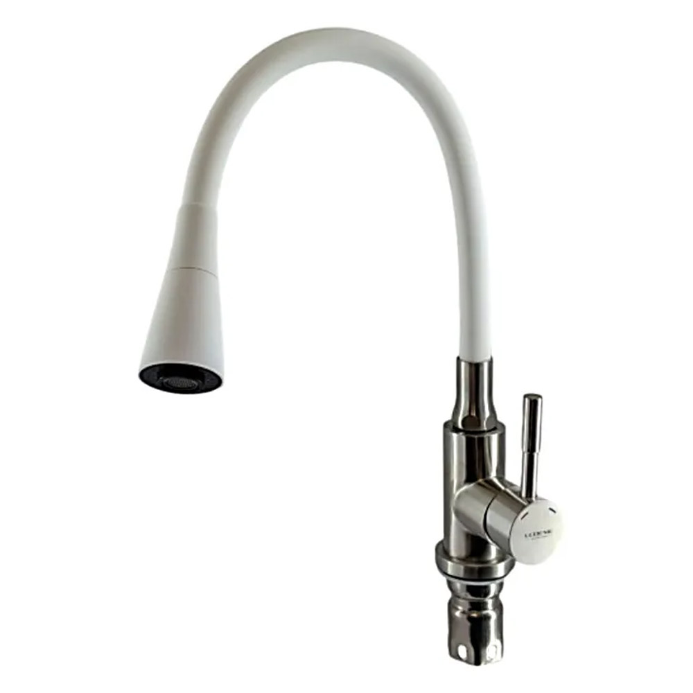 Смеситель для кухни 35 карт. LEDEME с бок. ручкой, гибкий излив, белый+нерж