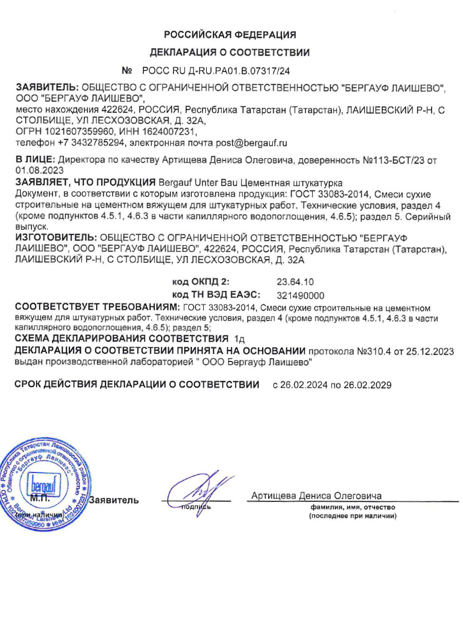 Штукатурка цементная 25,0кг BERGAUF Unter Bau для фасада и цоколя
