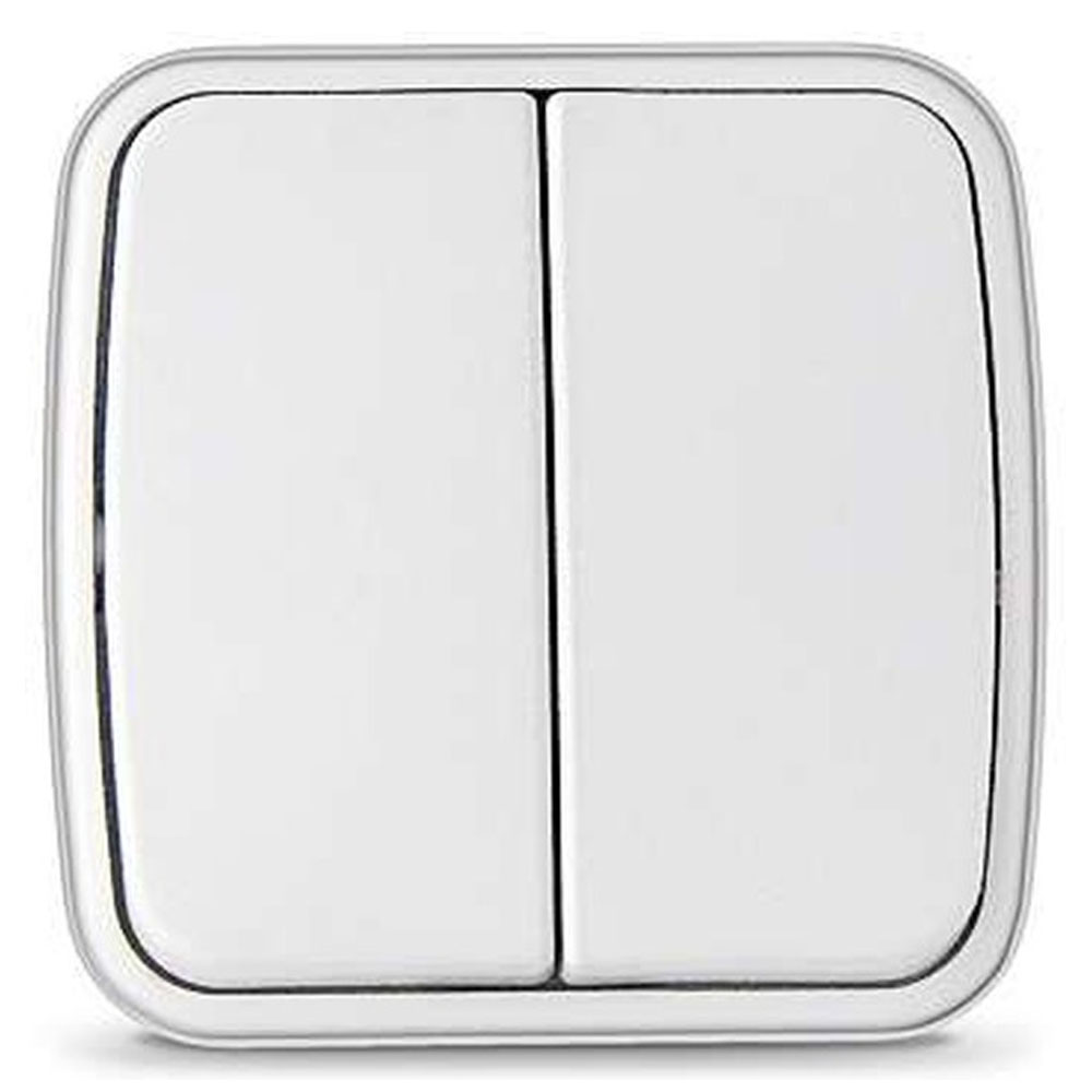 Представляет собой двухклавишный выключатель. Изготовлен из пластика, белого цвета.