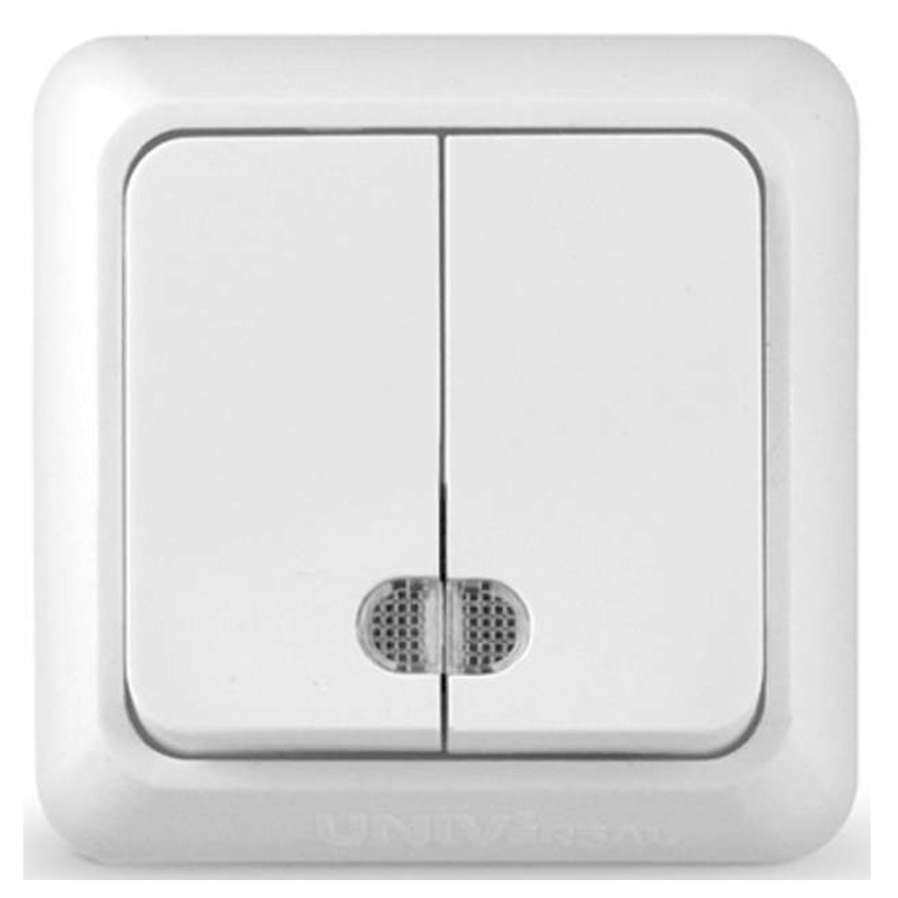 Двухклавишный выключатель с подсветкой, белый UNIVersal Олимп О0123 имеет классическую квадратную форму и белый цвет пластикового корпуса. Изделие легко устанавливается накладным способом. Служит для регулировки освещения многоламповых люстр или двух отдельных помещений, например, раздельного санузла или коридоров.