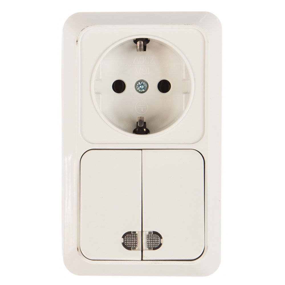 Вертикальный блок: двухклавишный выключатель c подсветкой + розетка с заземлением, белый UNIVersal Олимп О0041 - электротехническое устройство 2 в 1. Служит для подключения бытовых электроприборов к сети переменного тока. Благодаря индикаторной подсветке на клавишах блок легко идентифицировать в темном помещении для включения освещения