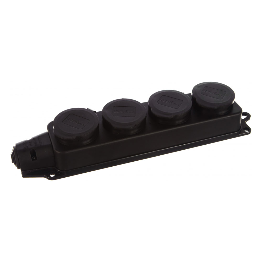 Однофазная 4-х местная колодка с заглушками, каучук UNIVersal 1029 - большая колодка с четырьмя розеточными гнездами, каждое из которых оснащено собственной защитной крышкой. Материалом колодки служит каучук. Изделие прекрасно подходит для мобильного и стационарного использования.